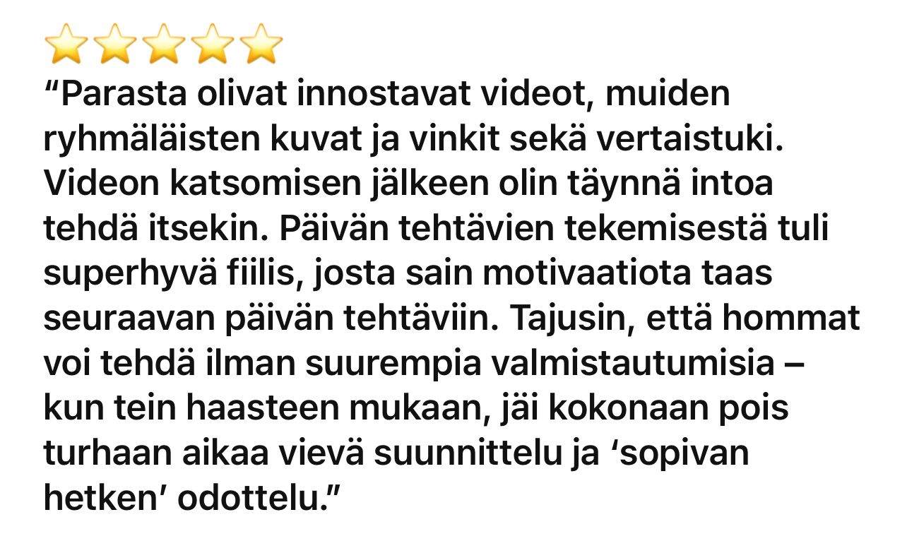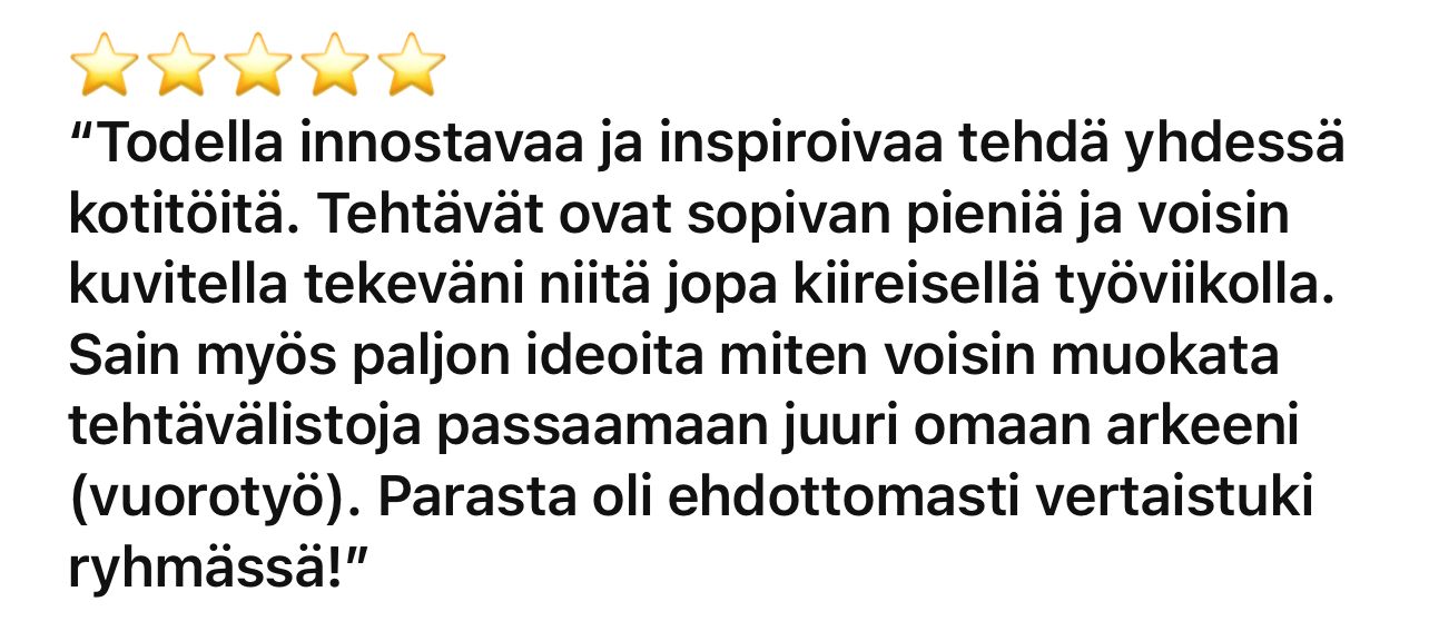 - Kodinhoitoluento "Pienet konkreettiset muutokset, joilla onnistut" livenä yhteisössä.