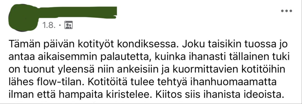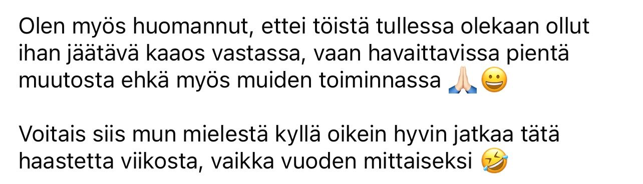 "Tehtävien tekemisestä tuli superhyvä fiilis, josta sain motivaatiota taas seuraavan päivän tehtäviin."