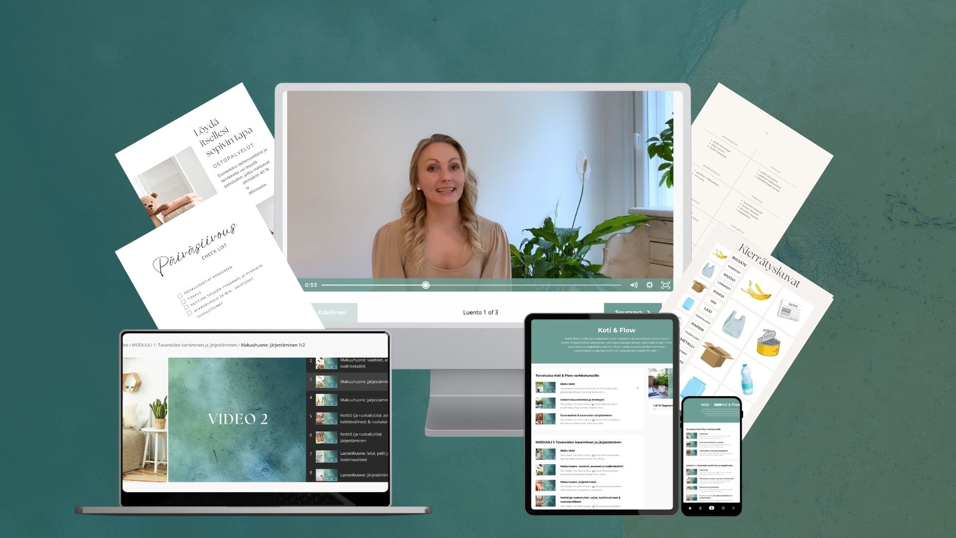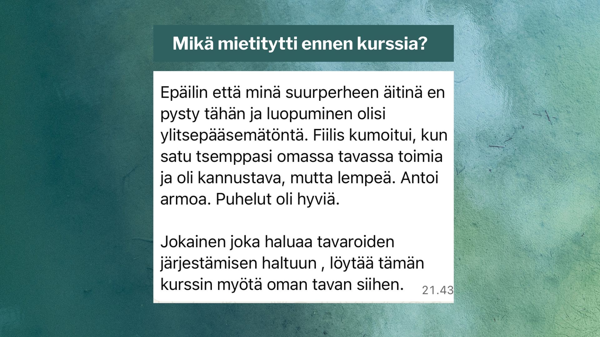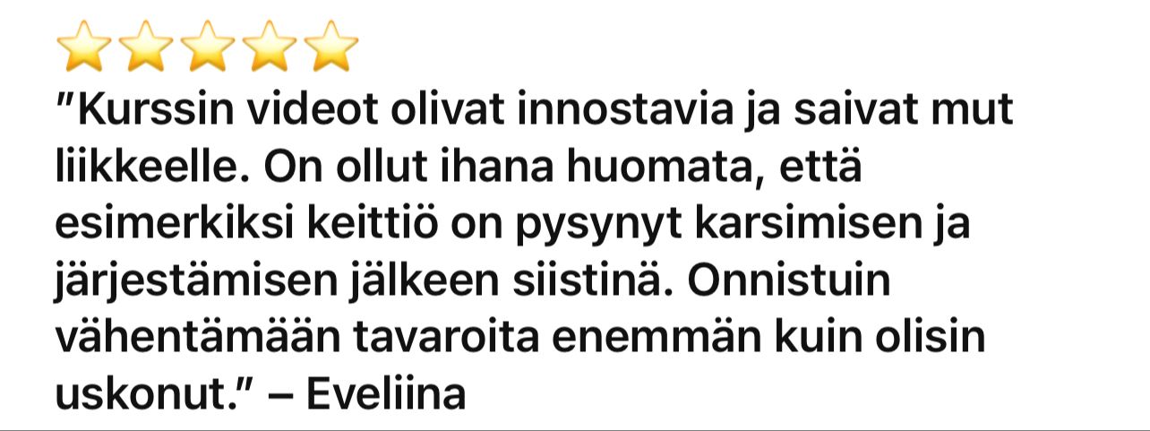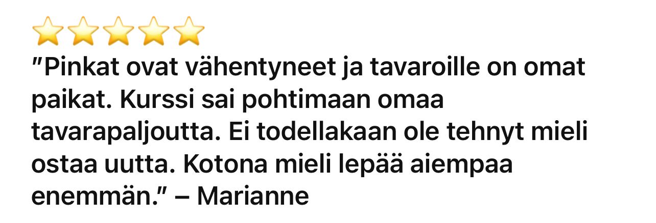 Kurssi syntyi omasta turhautumisestani: siivosin ja järjestelin, mutta se ei ollut koskaan pysyvää. Aina kun sain yhden kaapin järjestykseen, olohuoneessa odotti jo uusi kaaos ja jos viikonloppuna viikkailin vaatteita kauniisti paikoilleen, ne olivat parin päivän päästä taas pitkin lattioita.