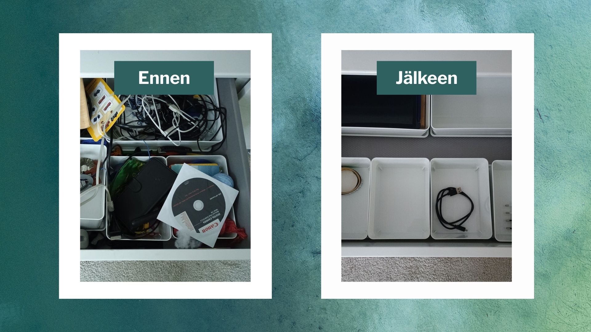 Järjestäminen tuntuu turhauttavalta, koska kun saat vihdoin sen eteisen lipaston päällisen karsittua ja tavarat kauniisti, niin ne poistetut tavarat vaan siirtyy lähimpään laatikkoon, johon sulla ei ollutkaan enää aikaa paneutua ja nyt se ei enää ees mee kunnolla kiinni.