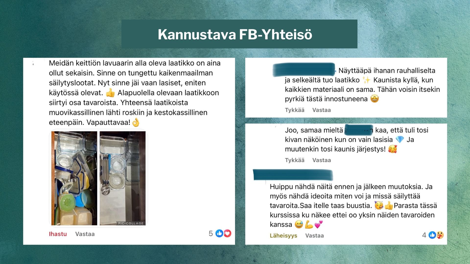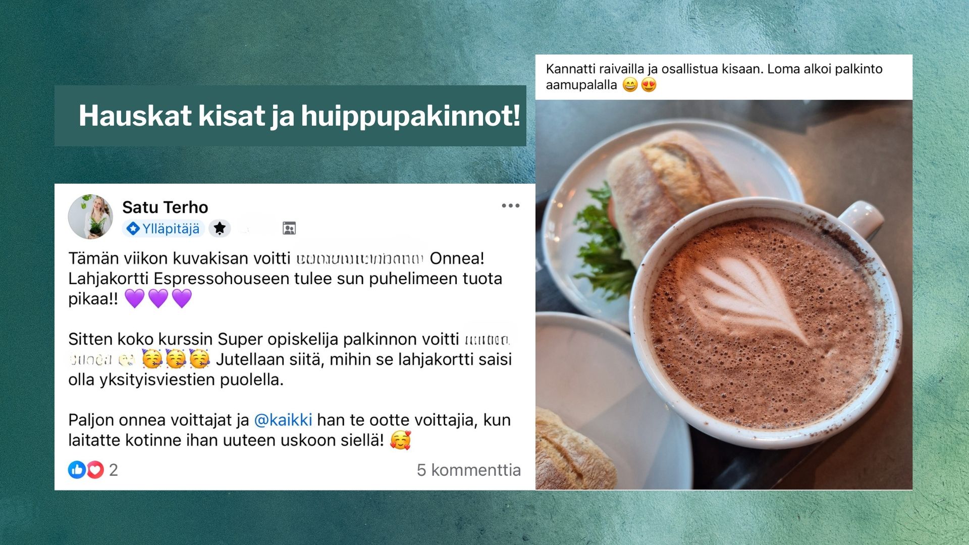 Kurssin yhteisö: vertaistukea, hauskoja kilpailuja joka toinen viikko upein palkinnoin. Jaetaan etenemistä kuvin ja viestein.