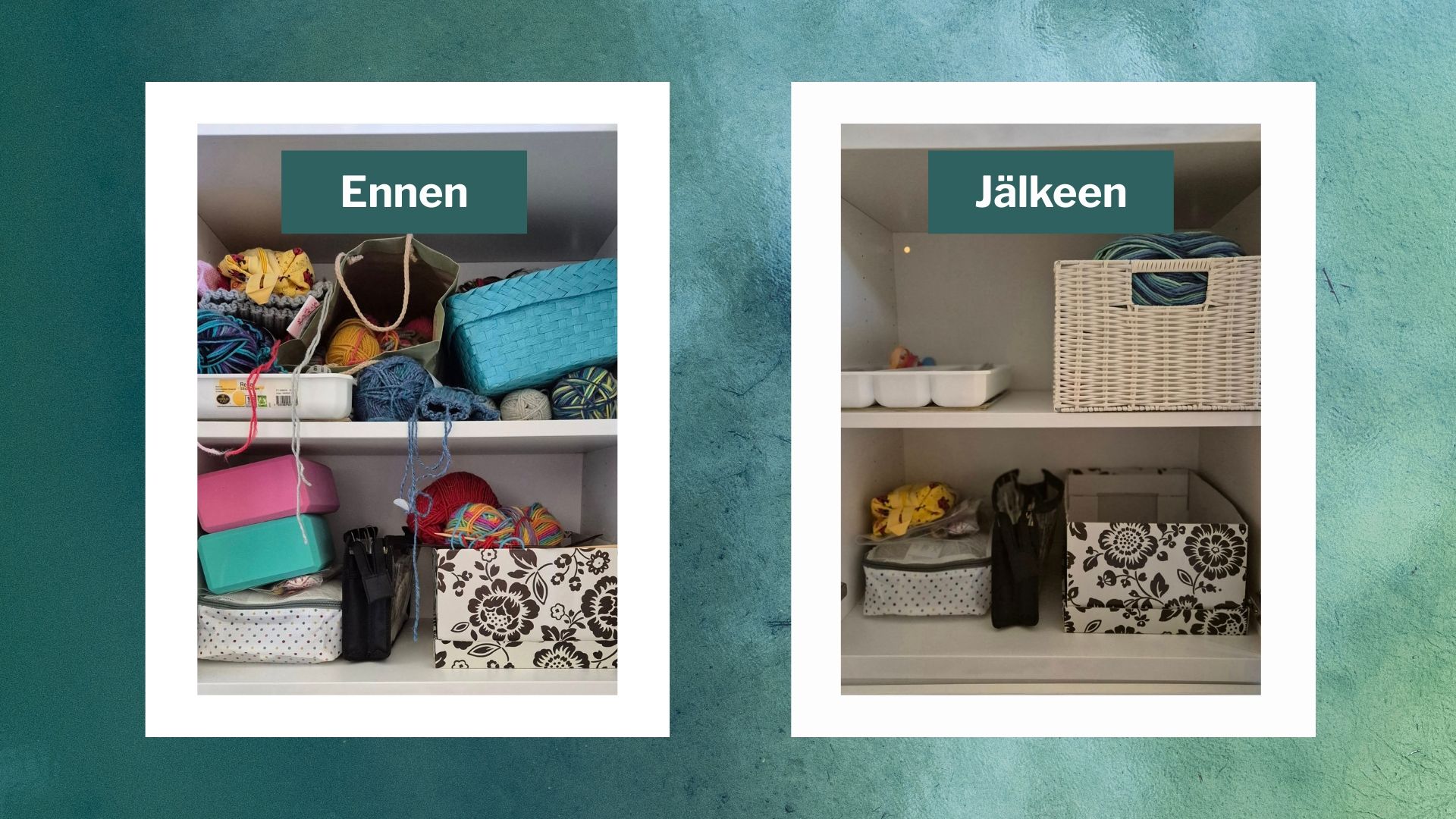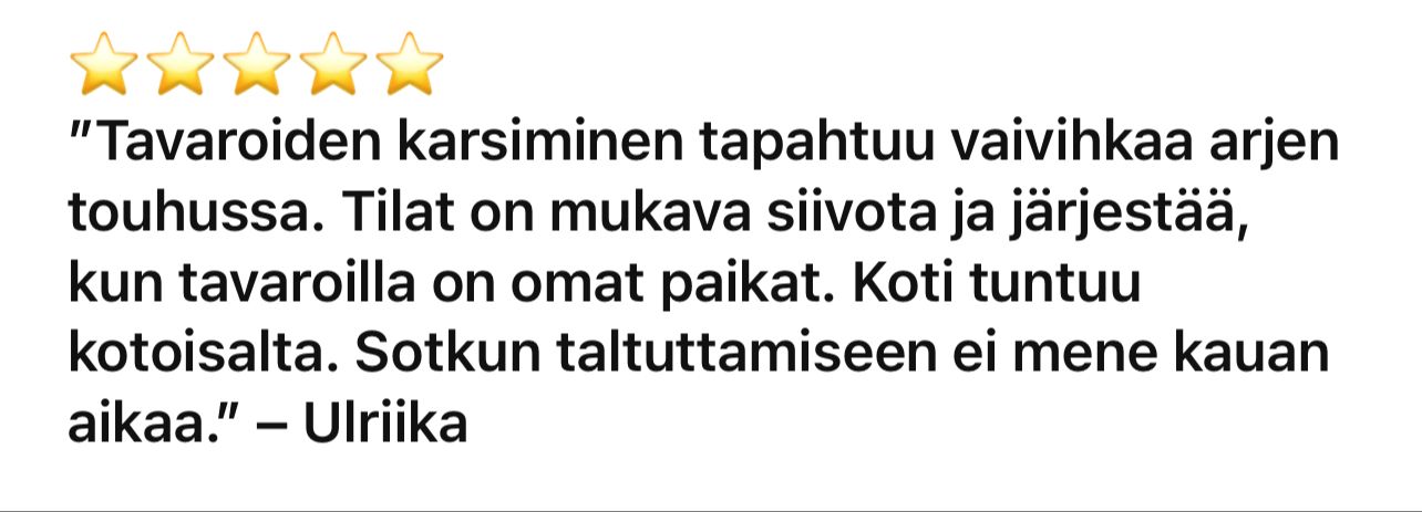 Juuri siksi mä en koskaan lähesty järjestelyä näin. Mun tavassa ei avata koko kaaosta kerralla, vaan puretaan sitä pienissä, hallittavissa osissa. Saat koko ajan selkeän etenemissuunnan ja helpot työkalut päätöksentekoon. Aika ei karkaa käsistä, kaaos ei leviä ympäri asuntoa ja lopputuloksena on pysyvä järjestys, joka toimii arjessa.