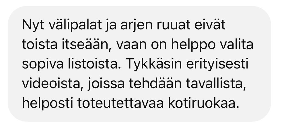 "Nyt välipalat ja arjen ruoat eivät toista itseään, vaan on helppo valita sopiva listoista"