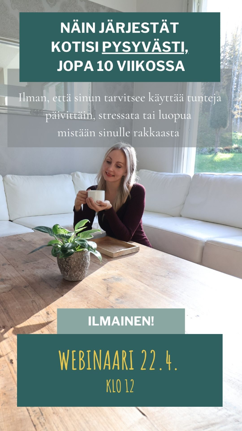 Tässä maksuttomassa webinaarissa jaan kanssasi selkeän suunnitelman, jonka avulla voit järjestää kotisi pysyvästi jopa 10 viikossa: