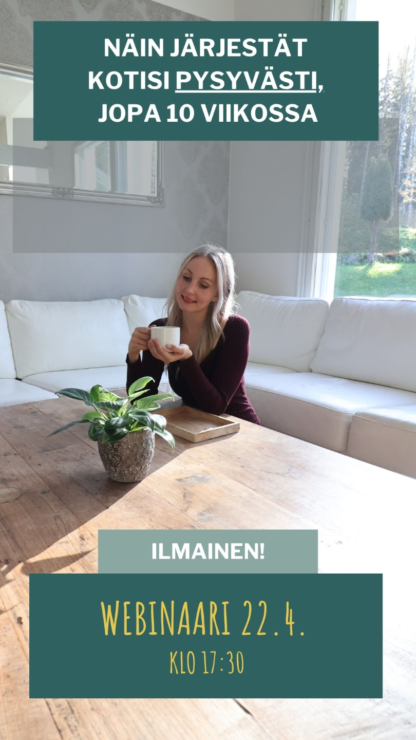 Tässä maksuttomassa webinaarissa jaan kanssasi selkeän suunnitelman, jonka avulla voit järjestää kotisi pysyvästi jopa 10 viikossa:
